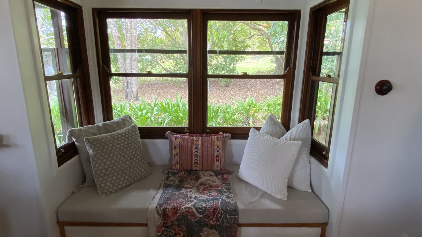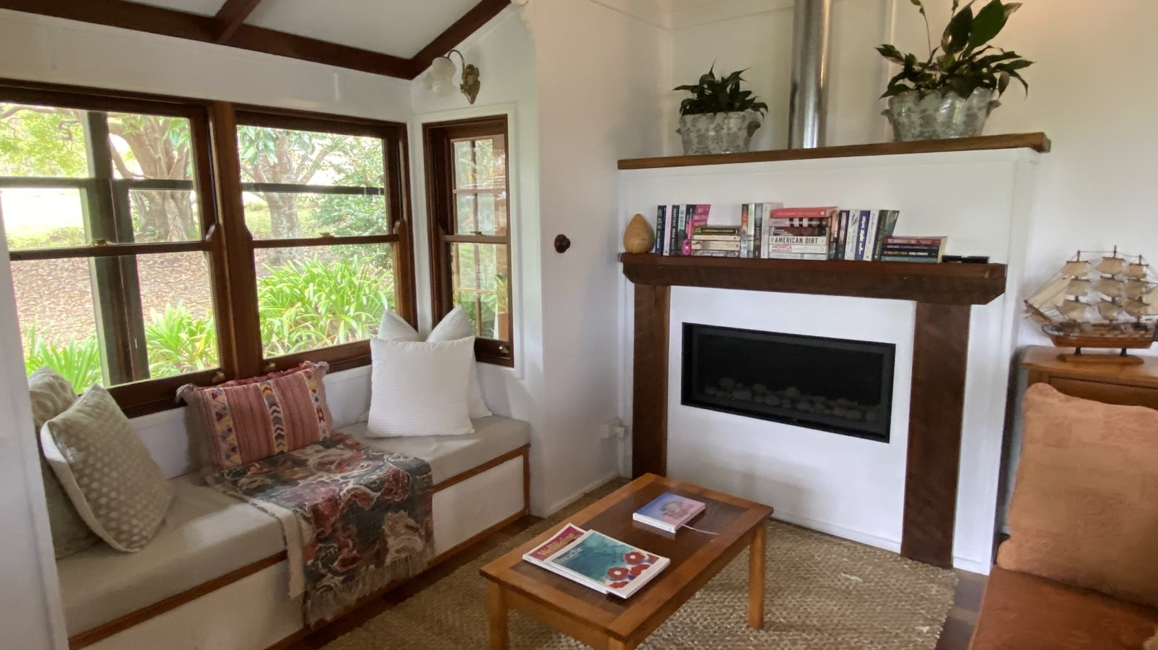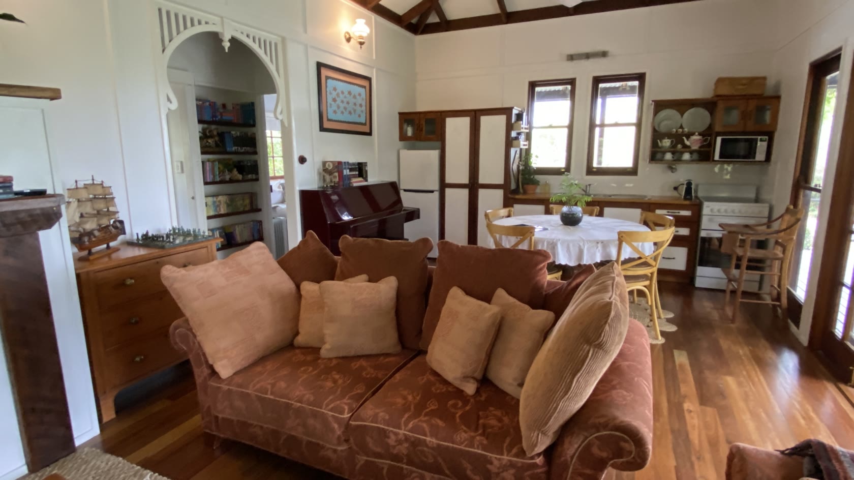 A large bay window and expansive french doors frame the living area. Two bedrooms comprising of a queen, double and single bed provide comfort and privacy, with a rustic bathroom situated in between.